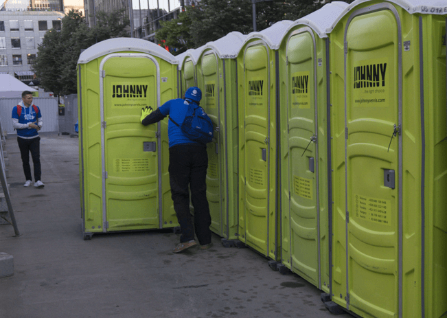 První, kam jsme byli vysláni za doprovodu „vedoucího skupiny“, bylo Václavské náměstí. Bylo třeba obrandovat zábrany. Takže jsme u sprch věšeli plachty, přetahovali toitoiky na správná místa… Tedy ještě v čistým stavu 😀